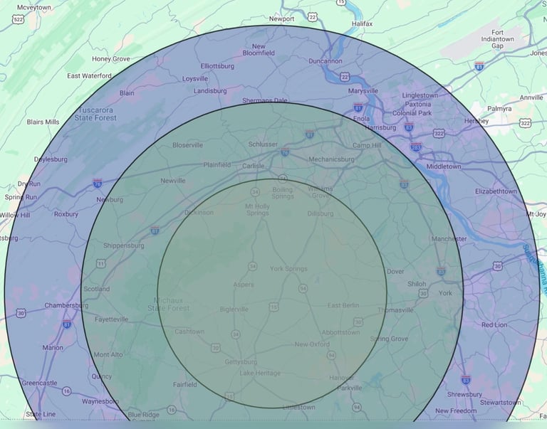 Measured one-way from our home base in Gettysburg, PA